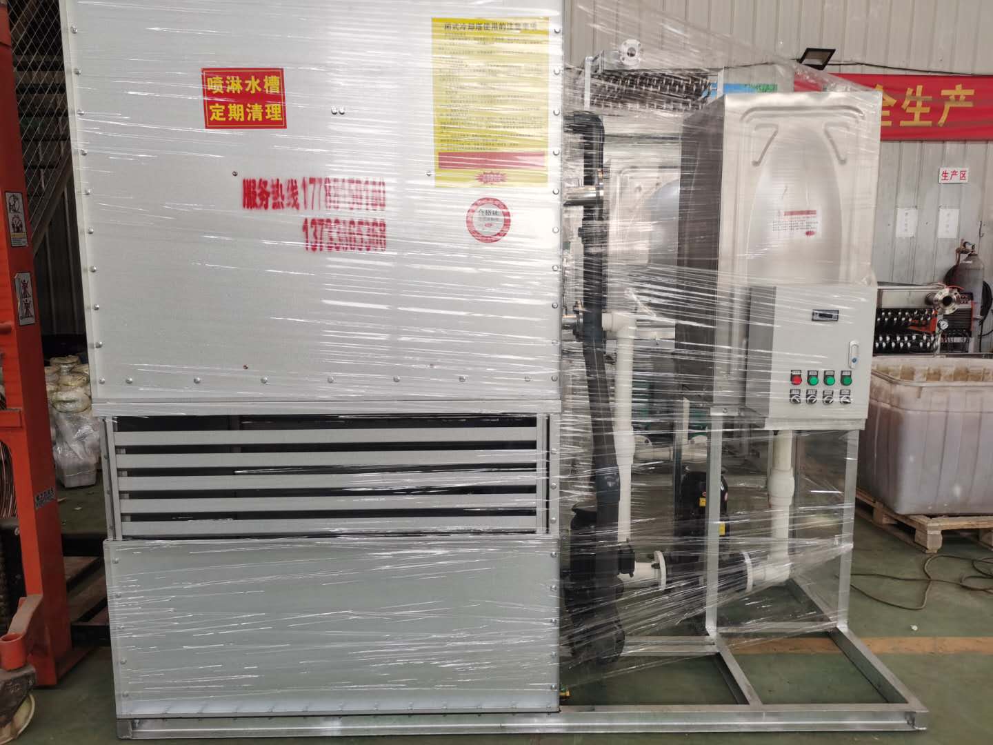 閉式冷卻塔利用兩級(jí)冷卻方式即:一級(jí)冷卻采用風(fēng)冷,依靠風(fēng)對(duì)冷卻器盤(pán)管進(jìn)行冷卻;二級(jí)冷卻采用風(fēng)冷和噴淋,在環(huán)境溫度比較高時(shí)使用二級(jí)冷卻,在風(fēng)冷的同時(shí)噴淋系統(tǒng)將水淋到冷卻器表面上,在水蒸發(fā)時(shí)能夠帶走盤(pán)管的熱量,從而達(dá)到冷卻效果。