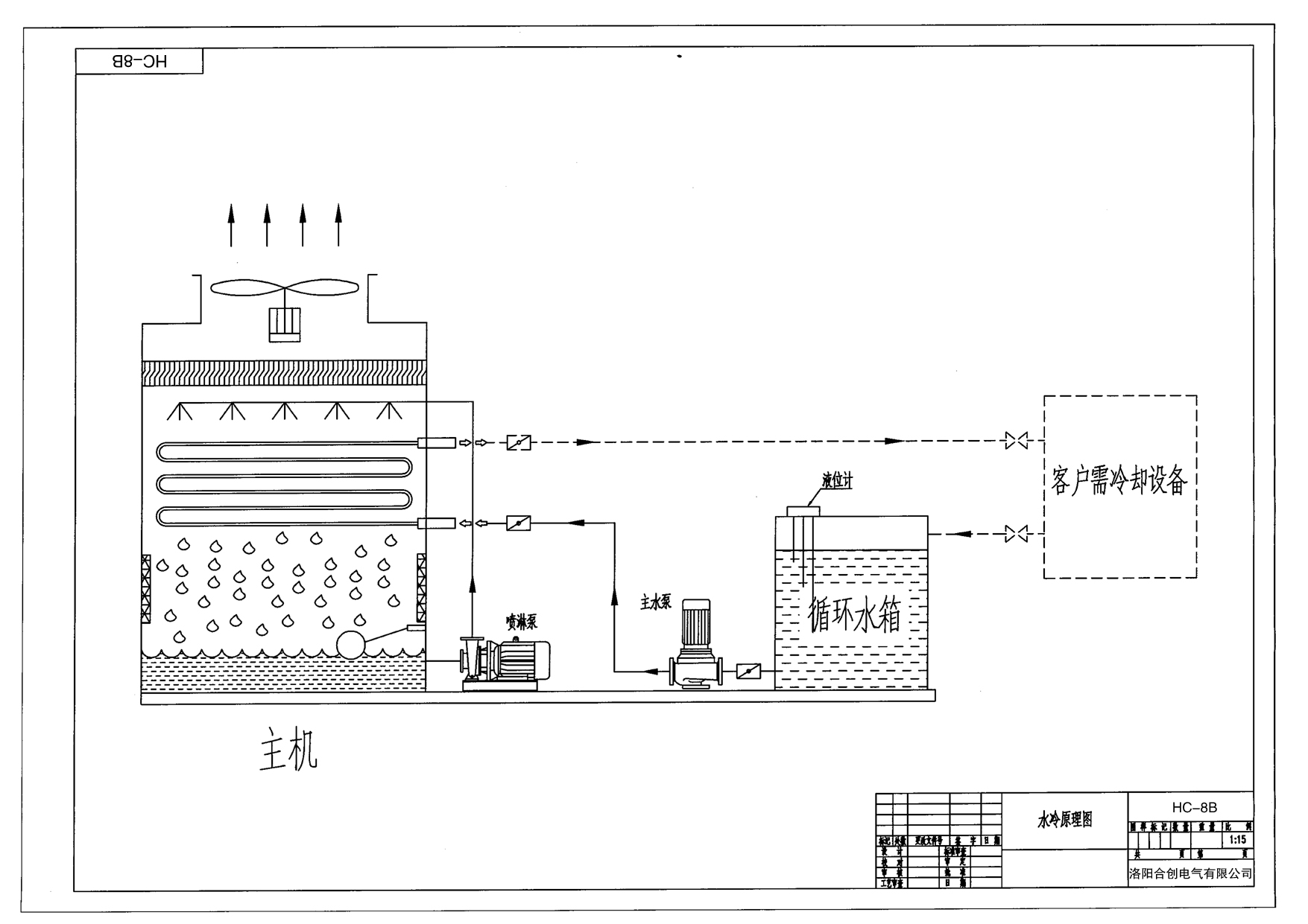 4)系統(tǒng)配置我公司新型電控系統(tǒng),配有備用泵,對備用水泵進行切換,溫控噴淋水泵、風(fēng)機,冷卻塔出水溫度顯示,高溫報警、壓力報警等功能。操作方便節(jié)能。